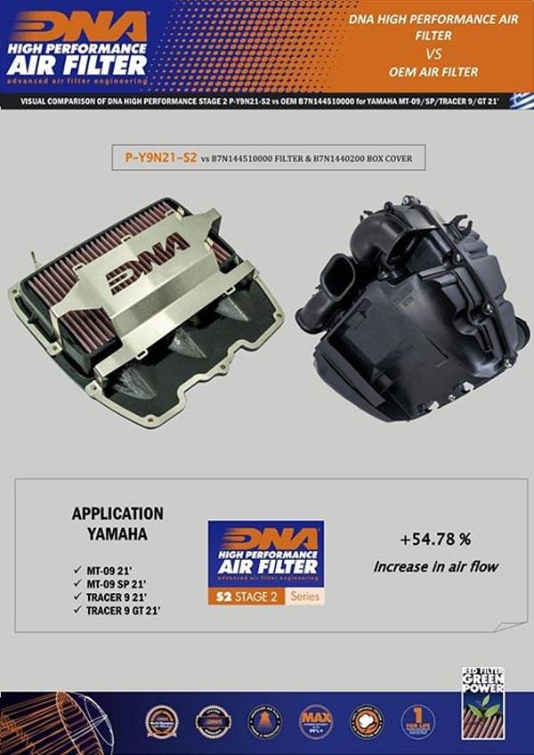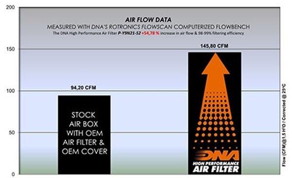 Der Luftstrom dieses neuen DNA Stage 2 Luftfilters ist +54,78 % höher als der des serienmäßigen Yamaha Luftfilters.