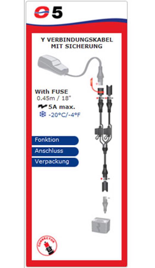 Y VERBINDUNGSKABEL MIT SICHERUNGSPLITTER Verwendung wie dargestellt oder zum Anschließen von 2 SAE-kompatiblen Zubehörteilen. Zum Anschließen an Nr.1 wetterfeste Anschlussleitung, die bereits an der Batterie angeschlossen ist. Nr.5, mit jeweils einer Sicherung 15 A an jedem Ausgang. Geeignet für den dauerhaften Anschluss von elektrischem Zubehör in Fahrzeugen.